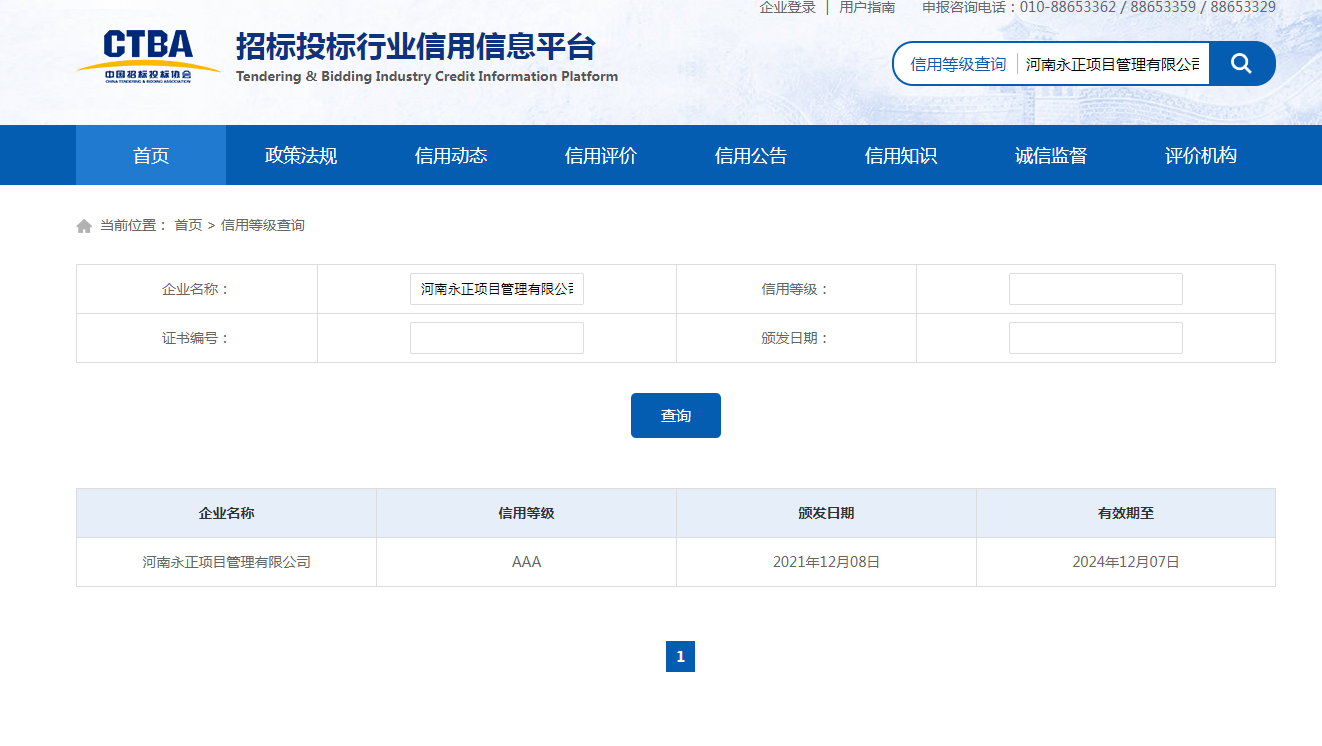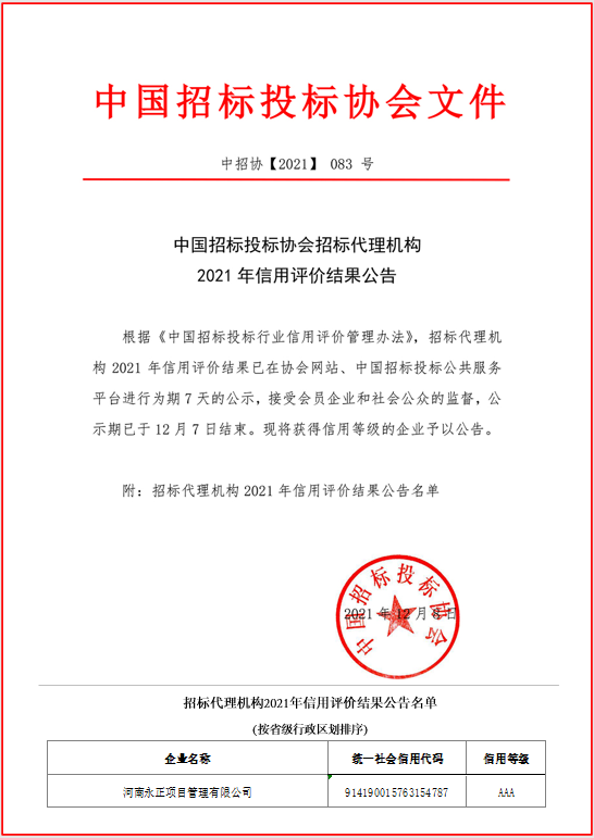 2021年12月8日,中国招标投标协会发布了招标代理机构2021年信用评价结果,河南永正项目管理有限公司继2016年度荣获中招协首批会员企业信用评价AAA单位后再次获得“招标代理机构信用评价AAA单位”荣誉,这是永正公司成立10年来获得国家级的又一项殊荣。