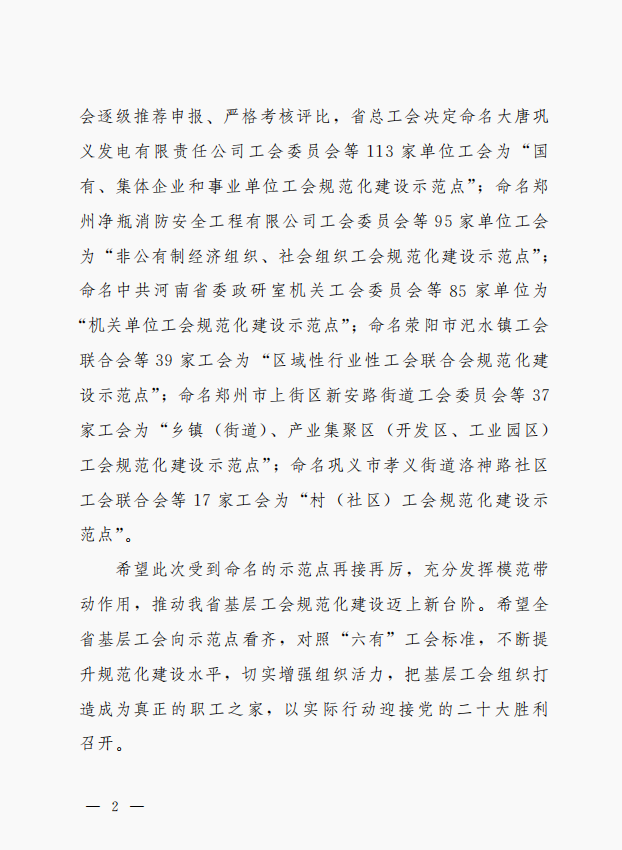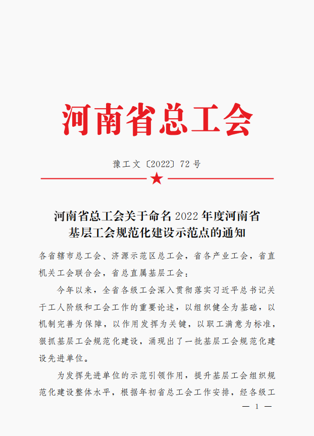 雷火官网地址工会委员会被河南省总工会命名为“2022年度河南省基层工会规范化建设示范点”