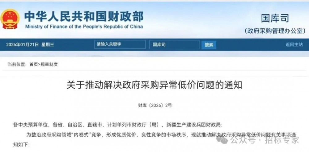 财政部《关于推动解决政府采购异常低价问题的通知》(财库〔2026〕2号),本通知自2026年2月1日起施行。