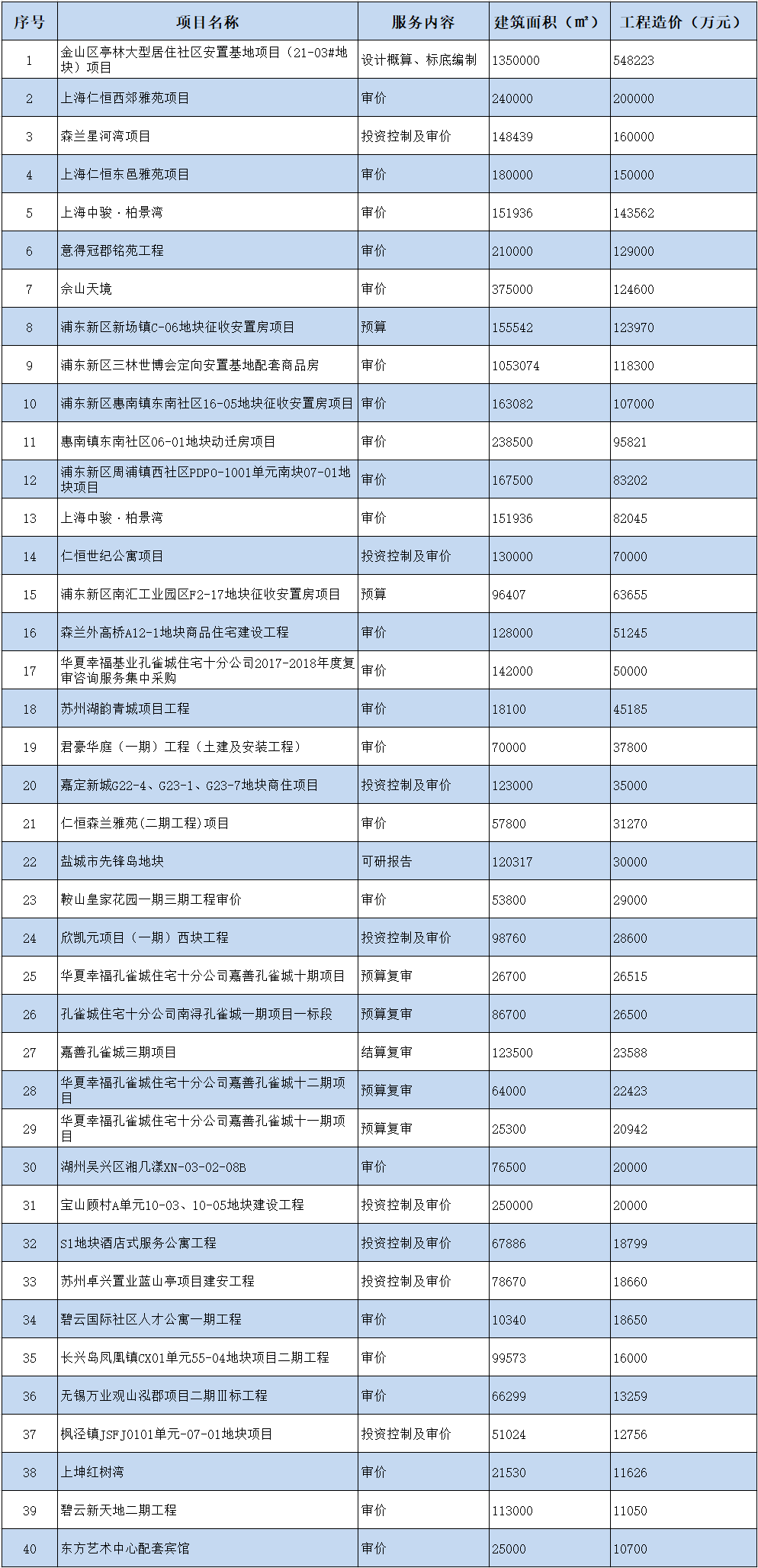 部分住宅工程造价咨询业绩一览表